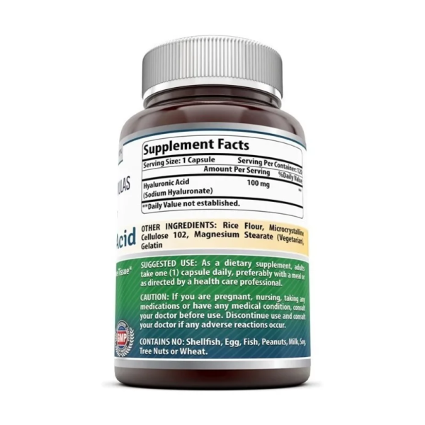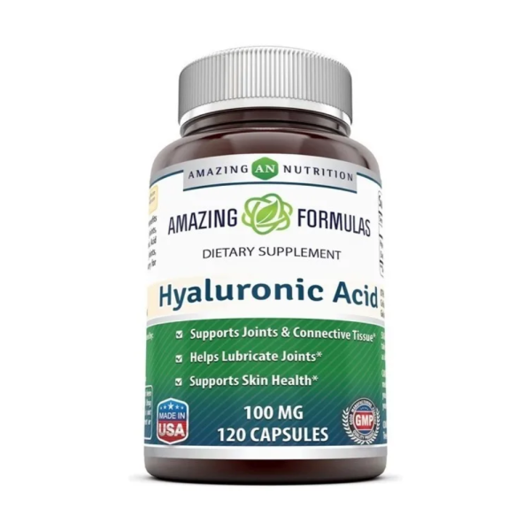 •Cosechar los beneficios de ácido hialurónico. El Ácido Hialurónico es conocido para apoyar la saluda de las articulaciones y el tejido conectivo y mejorar la salud de la piel. Amazing nutrición ácido hialurónico cápsulas te dan 100 mg de esta sustancia beneficioso natural.