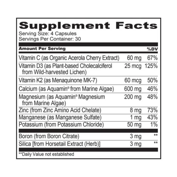•Mejor absorción: incluye nueve cofactores críticos que mejoran la absorción de calcio – magnesio, zinc, manganeso, potasio, boro y silicona, así como vitaminas C, D3, y K2.