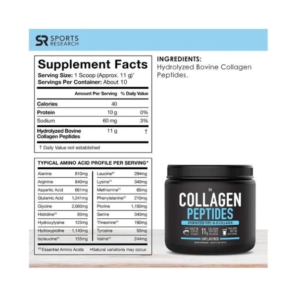 •Cada cuchara contiene 0.39 oz de péptidos de colágeno hidrolizados con 0.35 oz de proteínas y 18 aminoácidos, incluyendo glicina, prolina e hidroxiprolina.