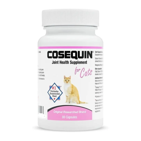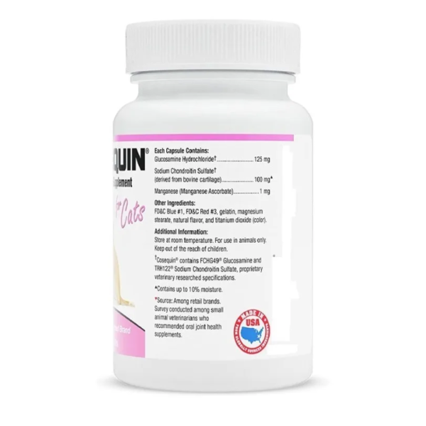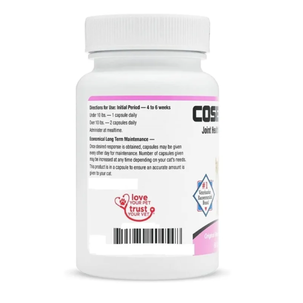Cosequin para gatos es un complemento nutricional para ayudar a tu mascota a mantener las articulaciones saludables. A medida que su mascota envejece, es común que sus articulaciones se vuelvan menos flexibles, lo que afecta su movilidad y calidad de vida. Cosequin es la marca de veterinarios más recomendada para apoyar y mantener la salud de las articulaciones de su gato. La única marca de suplementos para la salud de las articulaciones que ha demostrado ser segura, eficaz y biodisponible en estudios veterinarios de EE. UU. Revisados por pares, publicados y controlados. Cosequin para gatos ayuda a respaldar la producción de cartílago y protege el cartílago existente de la descomposición. Se fabrica siguiendo estándares similares a los que practica la industria farmacéutica. Cada cápsula contiene al menos 125 miligramos de clorhidrato de glucosamina, 100 miligramos de condroitín sulfato de sodio y 1 miligramo de manganeso. Lea toda la información de la etiqueta en el momento de la entrega. Indicaciones: Indicaciones para dejar de usar: Su veterinario es su mejor aliado en el manejo de la salud de su mascota. Si tu mascota tiene alguna afección que requiera atención médica, siempre debes consultar a tu veterinario. Mantener fuera del alcance de los niños. Solo para uso animal.