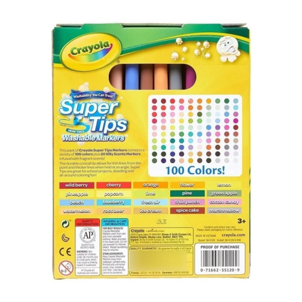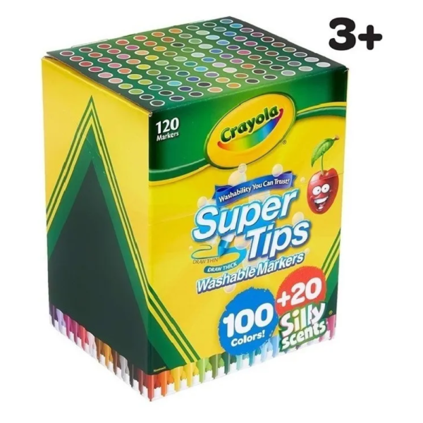 Rotuladores Super Tips y Silly Scents de Crayola: Disfruta de una amplia variedad con los 100 rotuladores lavables Crayola Super Tips y los 20 marcadores Silly Scents, incluyendo repeticiones de colores populares.