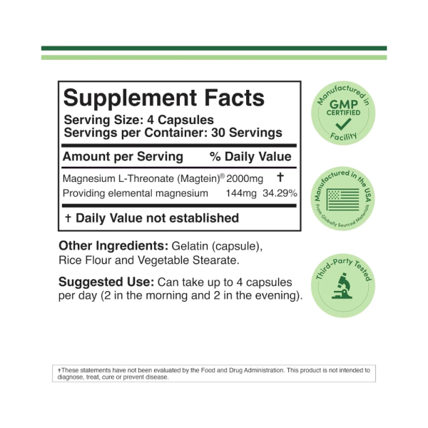Nuestro magnesio L-Treonato se presenta en cápsulas fáciles de consumir, permitiéndote integrarlo cómodamente en tu rutina diaria. La fórmula natural y alta biodisponibilidad de este suplemento asegura que tu cuerpo absorba de manera más eficiente el magnesio, un mineral esencial para diversas funciones biológicas.