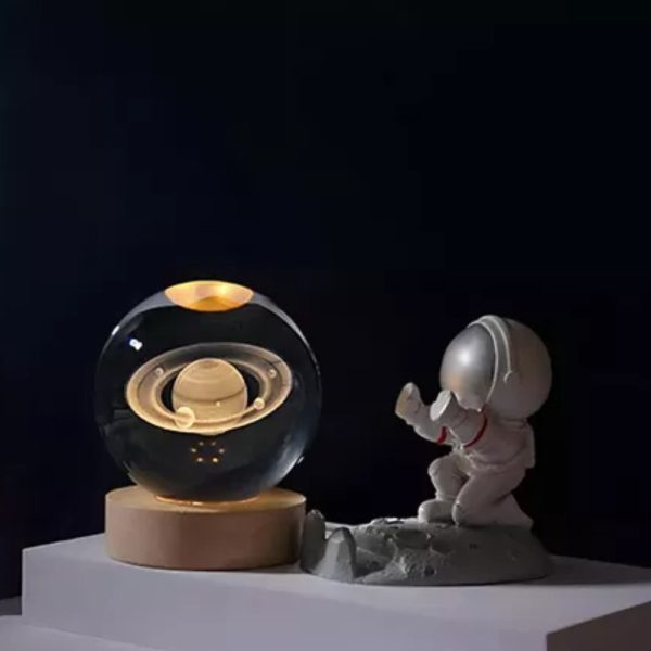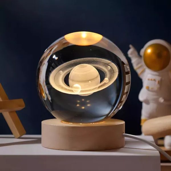 Lampara 3d Bola De Cristal Saturno Con Base Madera