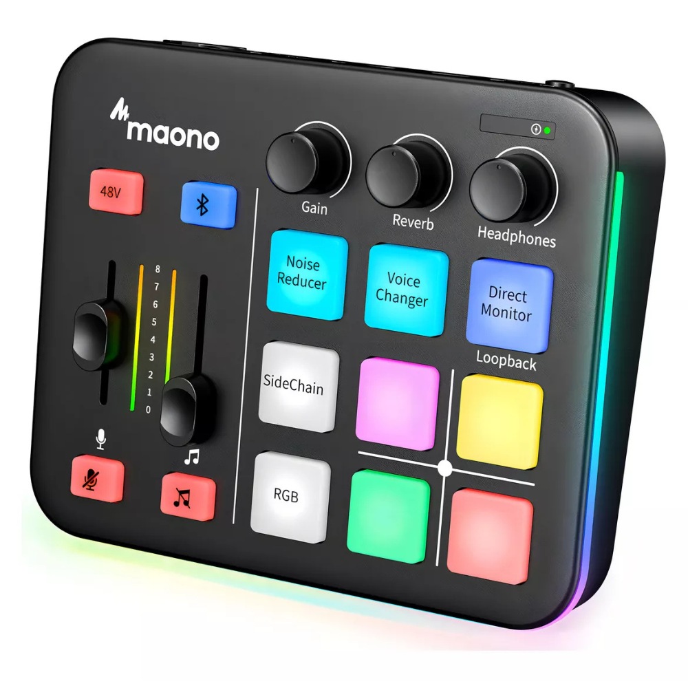 El Maono Caster G1 Neo incluye múltiples entradas y salidas, lo que facilita la conexión de micrófonos, instrumentos musicales, y otros dispositivos de audio. Además, cuenta con una interfaz intuitiva y controles de fácil acceso, permitiendo ajustar el volumen, los efectos, y otros parámetros de manera rápida y sencilla.