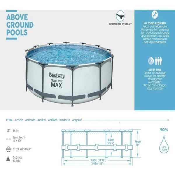 La Alberca Estructural Redonda Bestway Steel Pro Max es la opción ideal para disfrutar del verano en familia o con amigos. Con una capacidad de 6,473 litros, este modelo ofrece un espacio amplio y cómodo para hasta seis personas, permitiendo momentos de diversión y relajación en el agua. Su diseño en color gris con un atractivo patrón de piedra prismática se integra perfectamente en cualquier jardín o patio. Con una altura de 76 cm y un diámetro de 3.66 m, esta piscina es fácil de montar en aproximadamente 20 minutos con la ayuda de 2 a 3 personas. La estructura reforzada de acero anticorrosión garantiza durabilidad y resistencia, mientras que la válvula de desagüe facilita el vaciado cuando sea necesario. La Alberca incluye una bomba filtrante de 220V – 240V, un cartucho de filtro y un parche reparador, asegurando que tu experiencia sea completa y sin complicaciones. Fabricada en poliéster, es adecuada para niños a partir de 2 años, brindando un espacio seguro y divertido para los más pequeños. Disfruta de un verano inolvidable con la Alberca Estructural Redonda Bestway, donde la diversión y la comodidad se encuentran en un solo lugar. Ideal para reuniones familiares, fiestas o simplemente para relajarte en un día caluroso, esta piscina se convertirá en el centro de atención de tu hogar.