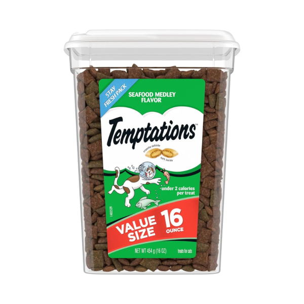Contiene un (1) tubo de 16 oz. de TEMPTATIONS Classic Cat Treats sabor Mariscos.