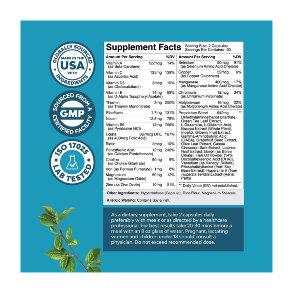 Suplemento de enfoque mental: prueba las vitaminas de memoria cerebral para mujeres y hombres y mejora la atención con nuestro suplemento nootrópico formulado con magnesio, vitamina E, vitamina A, vitamina B6, niacina y GABA
