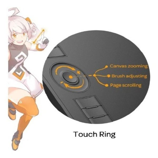 •1 anillo táctil: el anillo táctil se puede programar para zoom de lienzo, ajuste del cepillo y desplazamiento de página (acercamiento y rueda).