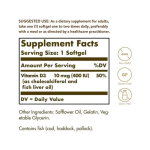 •Apoya tu sistema inmunológico; Solgar vitamina D3 (colecalciferol) 10 mcg (400 IU) cápsulas blandas apoyan un sistema inmunológico saludable y función neuromuscular.