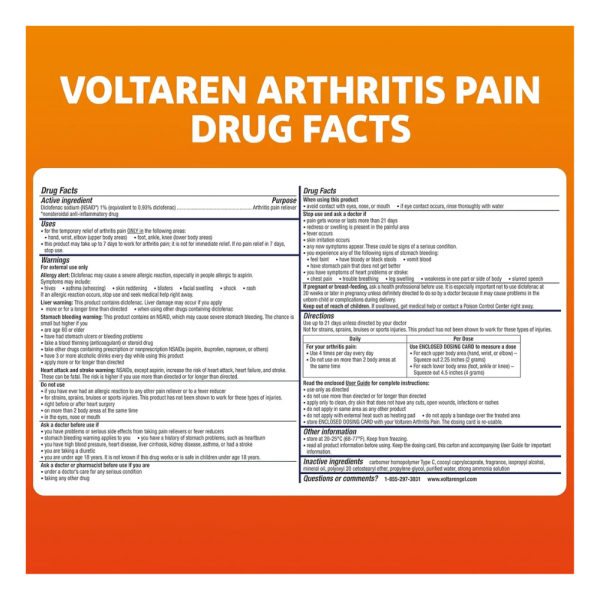 •Voltaren alivia el dolor de artritis, mejora la movilidad y reduce la rigidez para proporcionar fuerza de receta para aliviar el dolor de artritis en las articulaciones