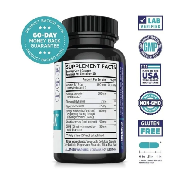 Vitamina B-12, Bacopa Monnieri, Fosfatidilserina, Ginkgo Biloba, Extracto de Rhodiola Rosea, DMAE. Otros ingredientes: gelatina (cápsula), harina de arroz, estearato de magnesio vegetal, sílice.